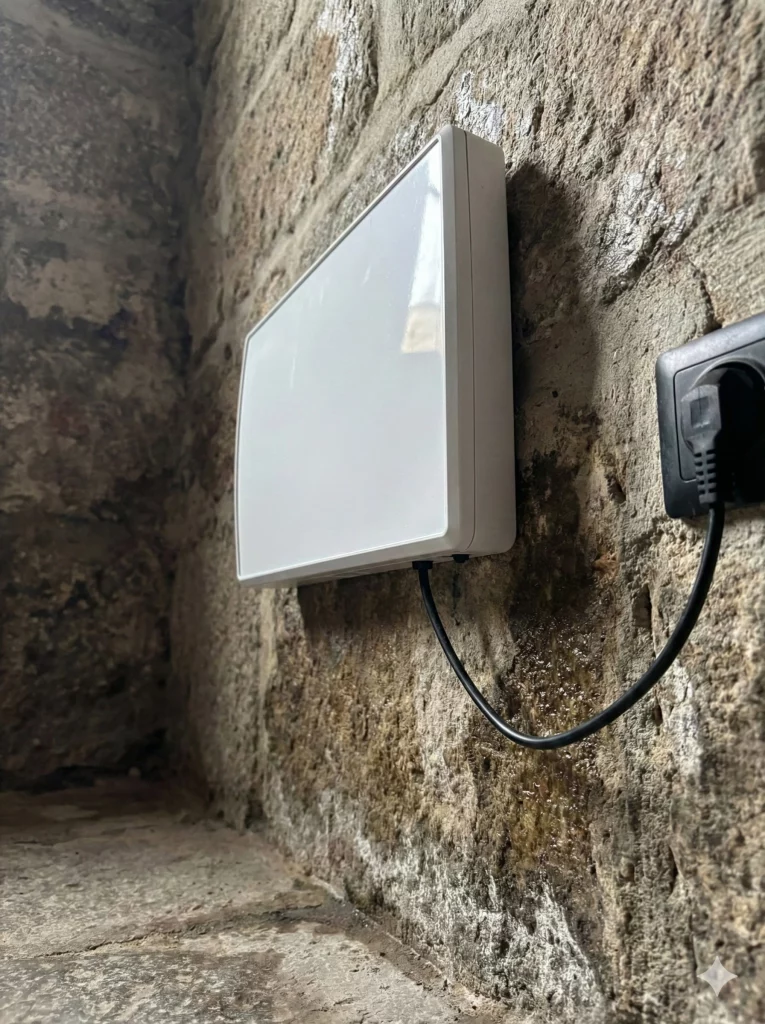Dispositivo ATE installato su parete in pietra con evidenti segni di umidità